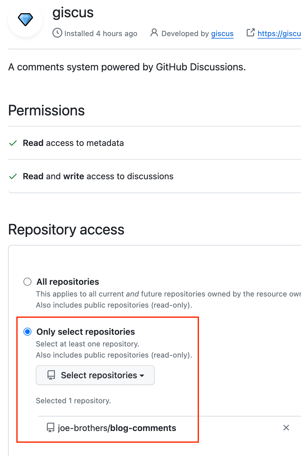 그 다음, giscus app을 해당 리파지토리에 설정한다.