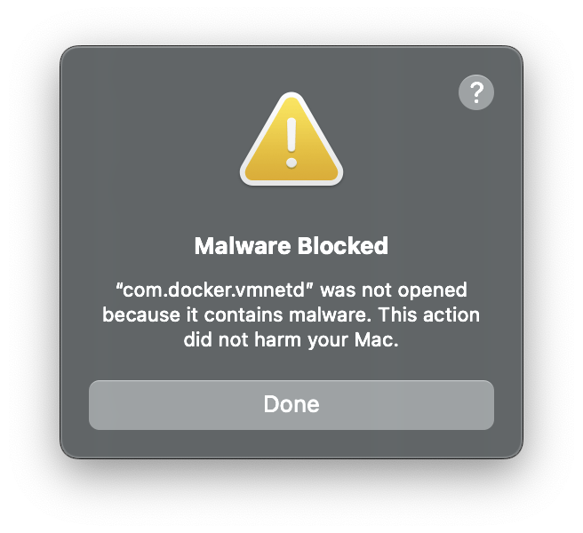 Malware Blocked - "com.docker.vmnetd" was not opened because it contains malware. This action did not harm your Mac.